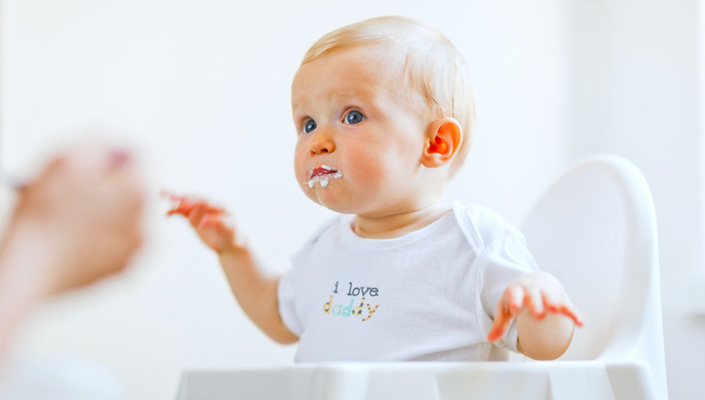 Cette diversification suit aussi le développement neuro-musculaire et psychomoteur de l’enfant qui, de la position couchée, va passer en position assise, et voudra alors attraper sa cuillère. Elle est aussi bien évidemment liée à l’apparition des premières dents : molaires et canines, qui vont permettre de passer des préparations liquides à des textures avec grumeaux puis morceaux de plus en plus gros.