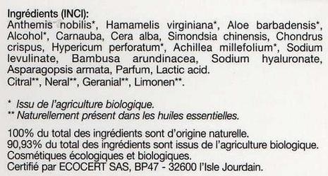 Les ingrédients sont indiqués d'après leur appellation selon l'inventaire INCI. Il s’agit d’une nomenclature internationale garantissant une dénomination unique quel que soit le pays de l'Union Européenne.