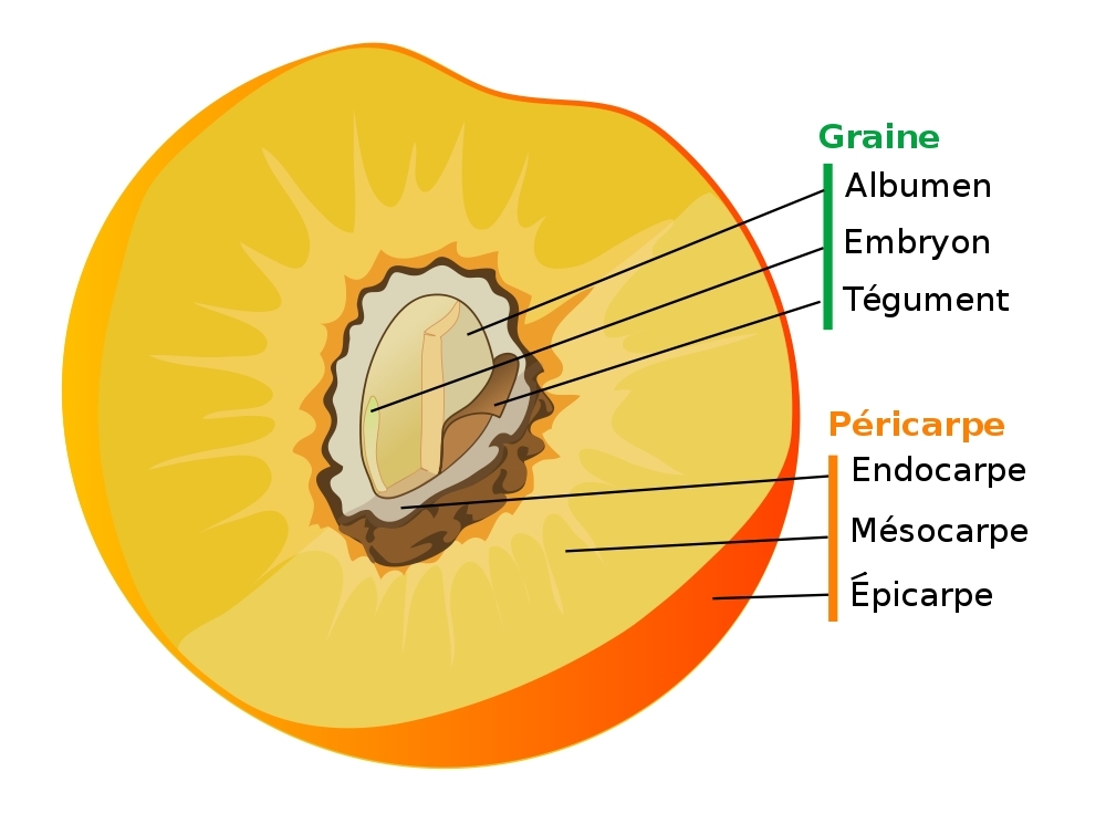 Succédant à la fleur par transformation du pistil, l’appareil reproducteur femelle des fleurs, le fruit se forme d’une part à partir de la paroi de l'ovaire (la cavité qui renferme les ovules), qui se transforme en péricarpe, et d’autre part à partir des ovules qui, une fois fécondés, donnent les graines. Le péricarpe est formé de trois couches : l’épicarpe (la peau du fruit), le mésocarpe (partie juteuse des fruits charnus) et l’endocarpe (le noyau), parfois lignifié (aspect de bois). C’est l’endocarpe qui enveloppe en général la ou les graines. Le rôle du fruit est de favoriser la reproduction de la plante, en la protégeant la ou les graines en formation contre les animaux et les contraintes climatiques, et en favorisant leur dissémination. |
