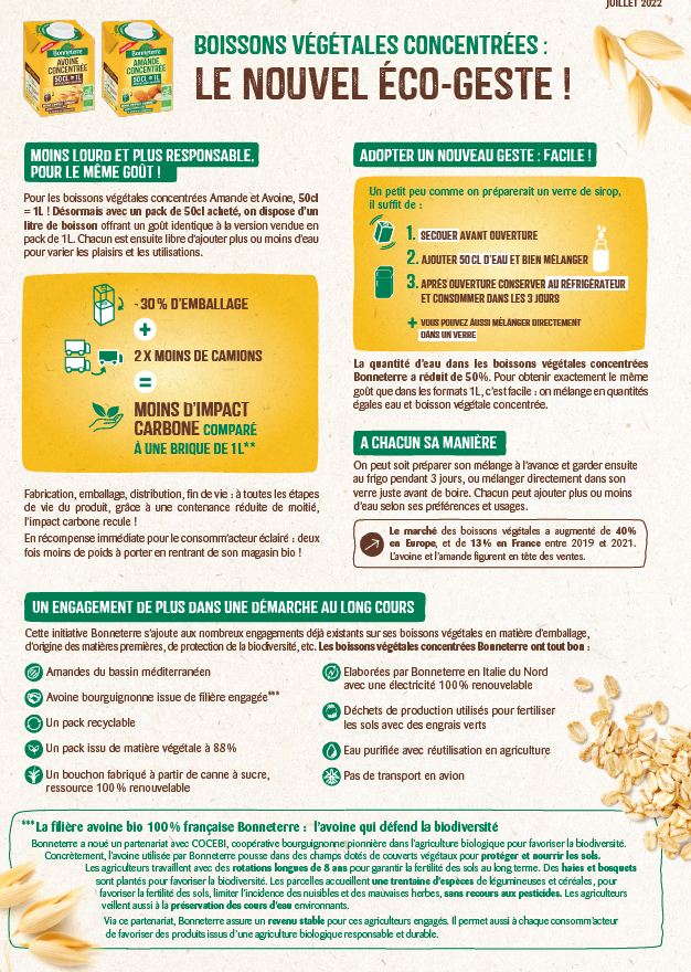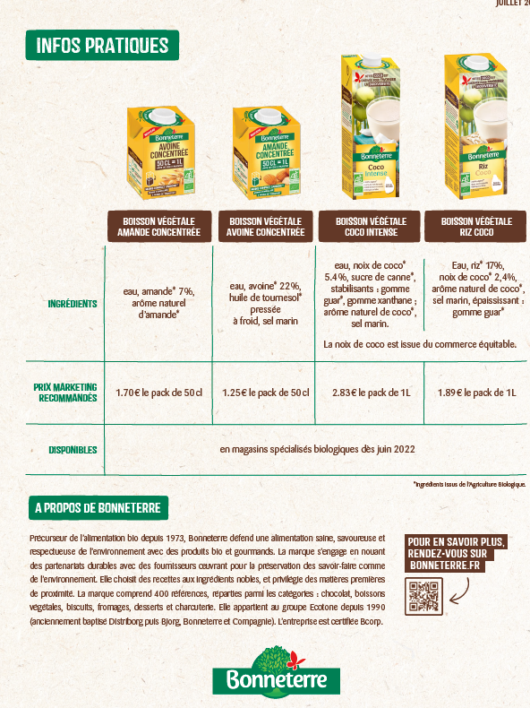 Leader sur les boissons végétales, Bonneterre propose aux gourmands sensibles aux enjeux environnementaux d’adopter un nouvel éco-geste : ajouter soi-même la quantité d’eau souhaitée à ses boissons végétales préférées pour réduire son impact carbone**. Un petit geste pour participer aux grands défis. En parallèle, la marque met en place la 1ère filière coco du réseau bio : pour participer à préserver un écosystème résilient et à garantir une utilisation durable des sols, au profit de la biodiversité et des agriculteurs.