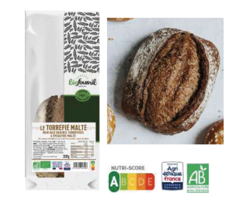 Spécialiste du pain biologique depuis 45 ans, BIOFOURNIL lance le pain torréfié malté, un nouveau pain BIO typé, doté d’une mie moelleuse et d’une croûte de caractère. Les amateurs de saveurs originales apprécieront le délicieux mélange des 5 graines torréfiées (tournesol, lin brun, sésame, courge, pavot) à l’épeautre malté. Fabriqué à partir de farine de blé équitable français Agri-Ethique, il est riche en fibres (6,1g pour 100g), source de phosphore et de magnésium et bénéficie du Nutriscore A. Il est issu d’un savoir-faire boulanger traditionnel à partir de levain à l’ancienne, dont seul BIOFOURNIL a le secret. En tartines sucrées ou salées, au petit-déjeuner comme au goûter, le pain torréfié malté BIOFOURNIL ne manquera pas de satisfaire toutes les envies de ceux qui aiment se faire plaisir.