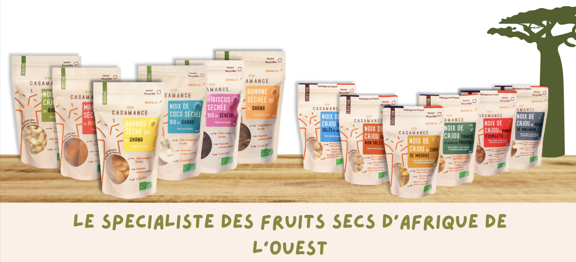 Ils partent de leur découverte sur la filière noix de cajou en Afrique de l’Ouest et fondent la marque Casamance dont la mission est de créer un débouché en France pour les fruits secs et les fruits séchés bio d’Afrique et, par ce biais, d’encourager le développement des filières de transformation locales et durables.