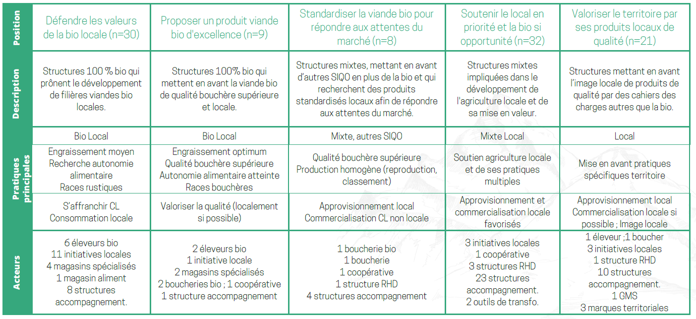 Les 5 positions stratégiques regroupent des structures différentes et se différencient selon la place du local et de la bio dans leurs pratiques. Par exemple, dans la position « Proposer un produit viande bio d’excellence », les éleveurs, initiatives, magasins, boucheries et coopératives ont les mêmes pratiques et la même vision de la viande bio : mettre en avant une viande bio locale de qualité bouchère supérieure.