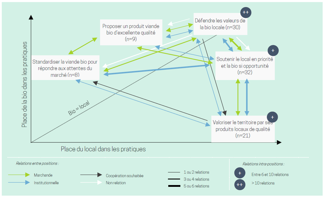 - De fortes relations à l’intérieur de la position « Défendre les valeurs de la bio locale » (spécifiées par le ++ sur le schéma).