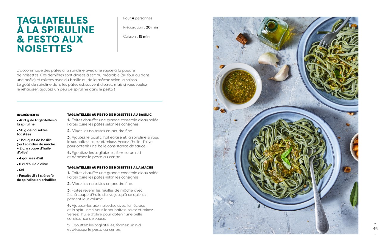 Sous la forme d’une poudre, de brindilles ou de paillettes, il est très facile d'intégrer la spiruline à vos différentes préparations sucrées, salées et à vos boissons. Son goût particulier se marie bien avec des sauces, des pâtes, des salades composées mais aussi des smoothies et des glaces. Découvrez dans ce livre, plus de 35 recettes à base de spiruline. Houmous au sésame noir, tagliatelles à la spiruline & pesto aux noisettes, soupe miso & spiruline, smoothie bowls, jus,… promis, il y en a pour tous les goûts !