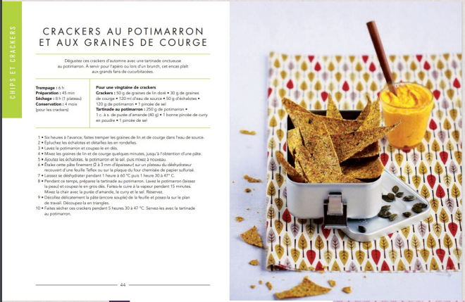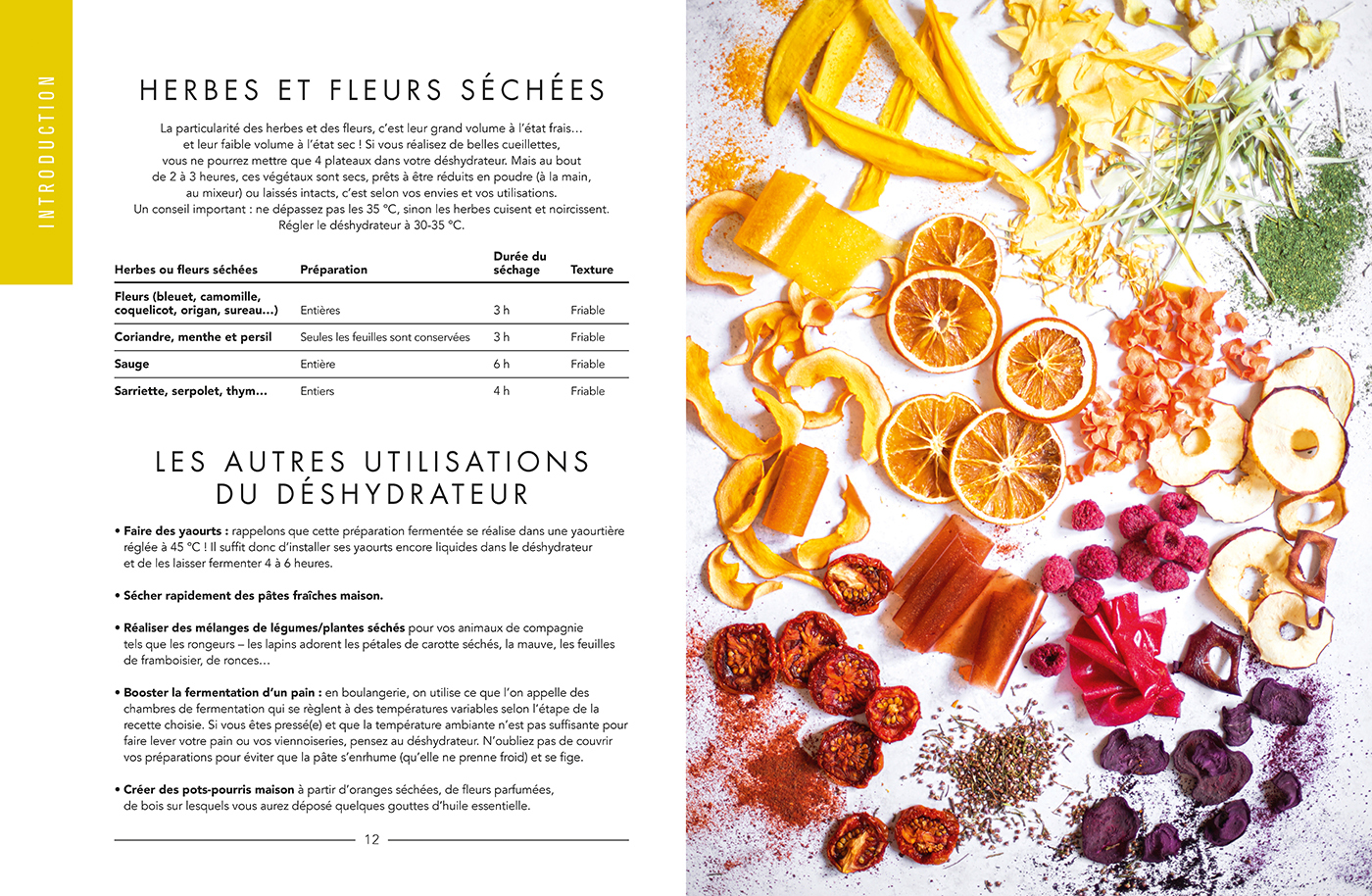 Dans cette édition enrichie par 10 recettes inédites, de nouvelles photos et une nouvelle mise en page, vous trouverez une introduction théorique à la déshydratation suivi d’une trentaine de recettes : • condiments, épices et poudres maison (condiments et épices, poudres colorantes…) ; • chips et crackers (chips de patate douce au colombo, pop-corn de chou-fleur, crackers de la forêt, minipizzas apéritives….) ; • cuirs de fruits (barquettes de mangue, rubans de kiwis qui piquent…) ; • biscuits et encas à base de céréales (barres multifruits aux grains de chia…).
