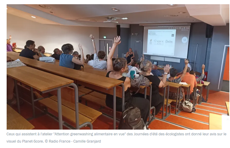 Dans une des salles du bâtiment Stendhal, à l'université Grenoble Alpes, ce vendredi 26 août, une cinquantaine de personnes s'intéressent au Planet-Score, une nouvelle étiquette inscrite sur certains produits alimentaires pour renseigner leur impact environnemental. Venues aux Journées d'été des écologistes, elles écoutent les explications de Sabine Bonnot, présidente de l'Institut technique de l'agriculture biologique (Itab), et de Claude Gruffat, eurodéputé, pour une conférence intitulée "Attention greenwahsing alimentaire en vue !", animée par Charlotte Lepitre, juriste en environnement.