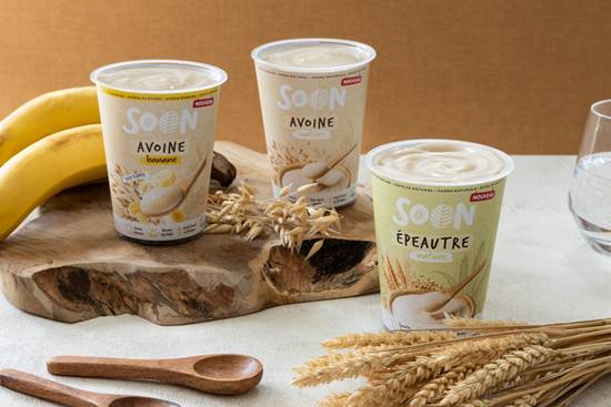 - Soon, avoine nature – Pot de 400 g – PVC 2,95 €: Composé à 95,7 % de jus d’avoine fabriqué à partir de farine française, ce dessert végétal nature, sans sucres ajoutés, séduit par son onctuosité et ses légères notes de céréales, avec une petite touche acidulée.