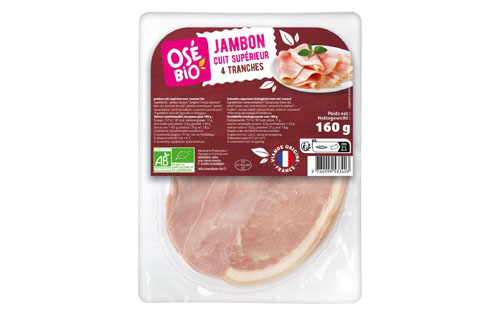 Le Jambon cuit supérieur Osé Bio est maintenant disponible au format 2 tranches avec couenne et également découenné en 4 tranches.