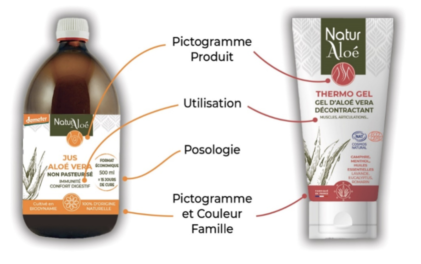 L’illustration est également plus représentative de la plante d’Aloé Vera, ingrédient principal des produits, et porte moins à confusion avec d’autres plantes ou fruits.