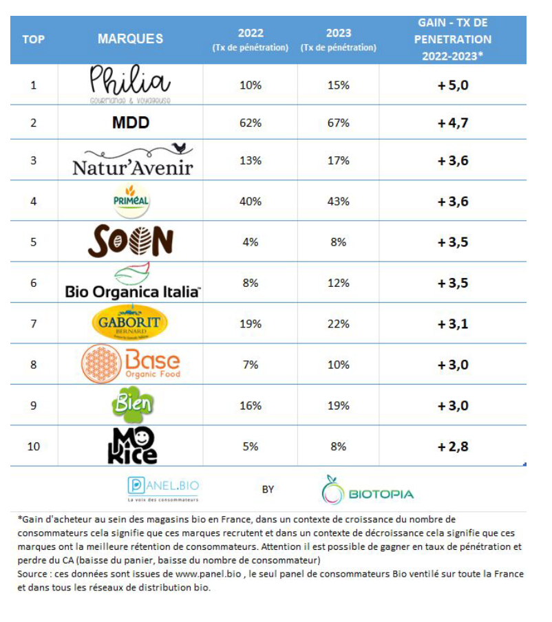 Ce classement recense les marques alimentaires (hors vrac) ayant connues la plus forte augmentation en taux de pénétration en magasin bio en 2023.