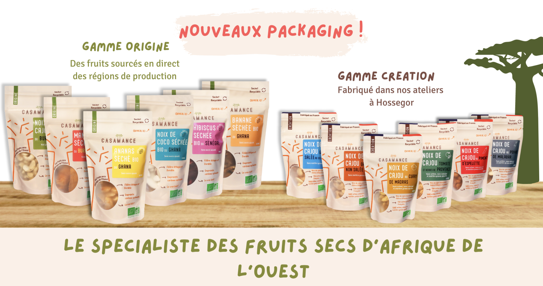 Une gamme harmonieuse, fraîche et qui a du sens ! Le produit et son origine sont mis en avant dans ce nouveau packaging car pour Casamance, la transparence et la traçabilité sont au cœur de ses engagements. Un QR code à l’arrière du sachet permet d’en connaître davantage sur chaque produit, son pays de production mais aussi le process de fabrication (décorticage des noix de cajou par exemple).
