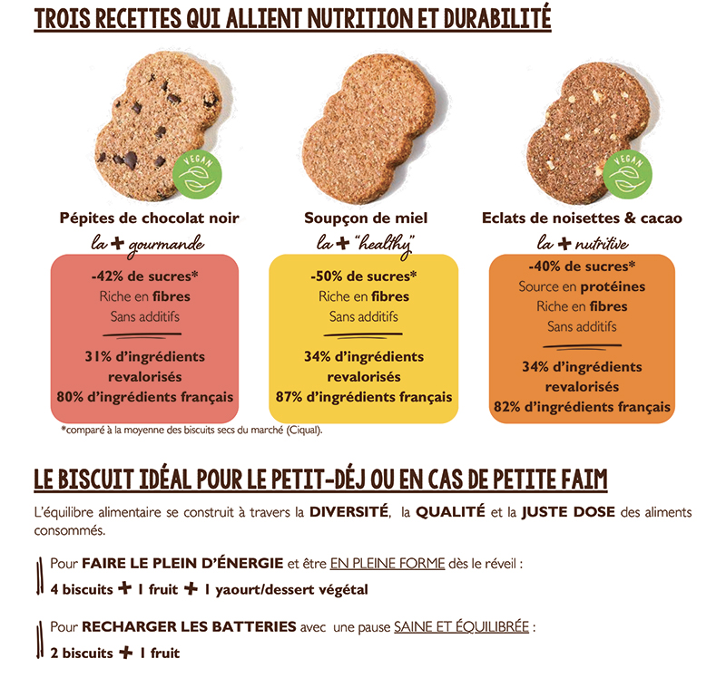 Nos nouveaux biscuits Petit-déj & en-cas : les biscuits les plus sains/nutritifs ET gourmands du rayon biscuits des magasins BIO. 3 nouvelles recettes toujours développés dans une démarche de lutte contre le gaspillage avec au moins 30% d’ingrédients revalorisés.