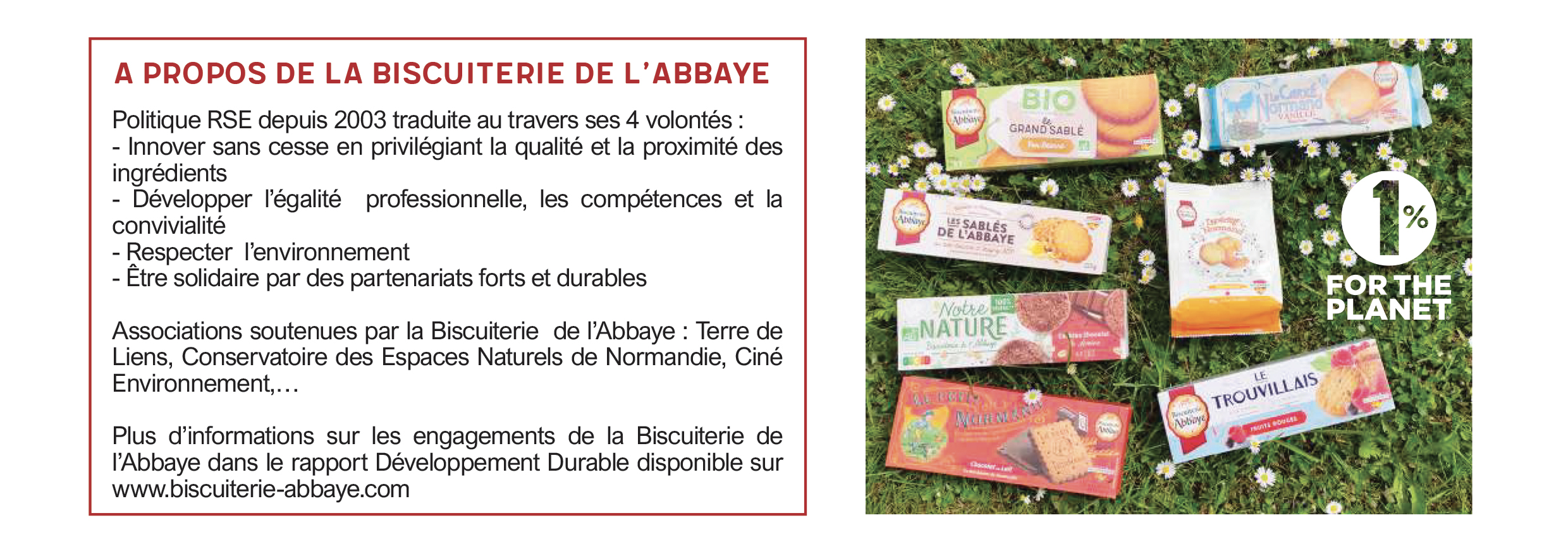 La Biscuiterie de l'Abbaye renforce aujourd'hui ses actions écoresponsables et sociales en adhérant au collectif 1% for the Planet. Ainsi, 1% du chiffre d'affaires des sablés à la marque Biscuiterie de l'Abbaye (vendus unique-ment en étuis) et à la marque Notre Nature, est reversé à des associations porteuses de projets pour préserver la planète. Un partenariat qui concrétise l'engagement mené depuis plusieurs années par la Biscuiterie, auprès des associations qui agissent sur des enjeux qui lui tiennent à cœur, comme l'agriculture biologique avec Terre de Liens ou la préservation de la biodiversité avec le Conservatoire des Espaces Naturels de Normandie.