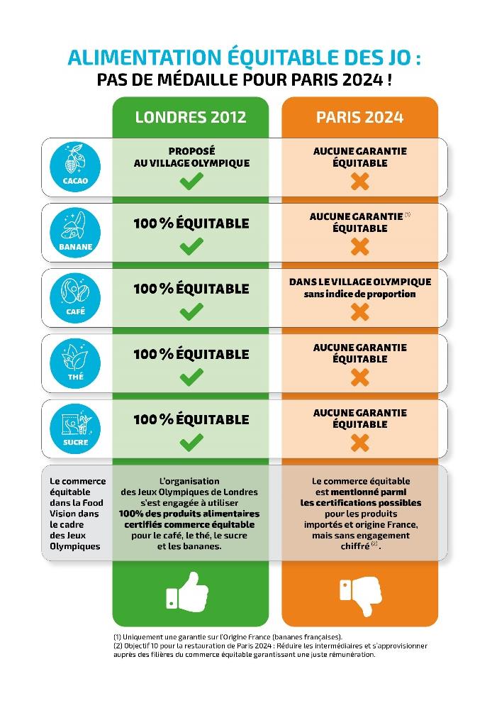 L’organisation des Jeux Olympiques de Paris 2024 a promis des jeux plus responsables et a décidé de mettre en avant l'inclusivité et la sobriété. En matière d’alimentation, l'accent a été mis sur l'approvisionnement en produits locaux, comme l’illustrent les nombreux engagements pour des catégories de produits 100% français (laitages, vin, céréales, viande, etc), favorisant le bien-être animal (100% oeufs issus d’élevage plein air) ou la pêche durable (100%). Si le commerce équitable est mentionné comme une option dans la « vision pour la restauration» aucun engagement chiffré n’a été pris, laissant ainsi le choix éthique important qu’il constitue lors d’un événement aussi symbolique à la discrétion des opérateurs économiques choisis pour restaurer les participants. A l’inverse, Londres 2012 avait choisi de faire de la certification équitable la norme obligatoire pour tous les produits venant des pays du Sud : cacao, café, sucre de canne, bananes…