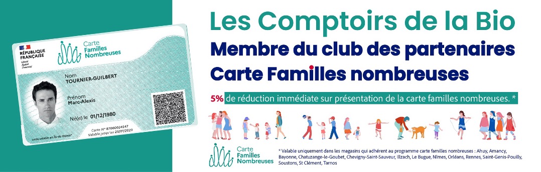 Les Comptoirs de la Bio offrent ainsi depuis le 1er septembre, 5 % de réduction immédiate aux détenteurs de la carte familles nombreuses, lors du passage en caisse dans les magasins participants (voir liste ci-dessous) et sur présentation de la carte familles nombreuses en cours de validité.