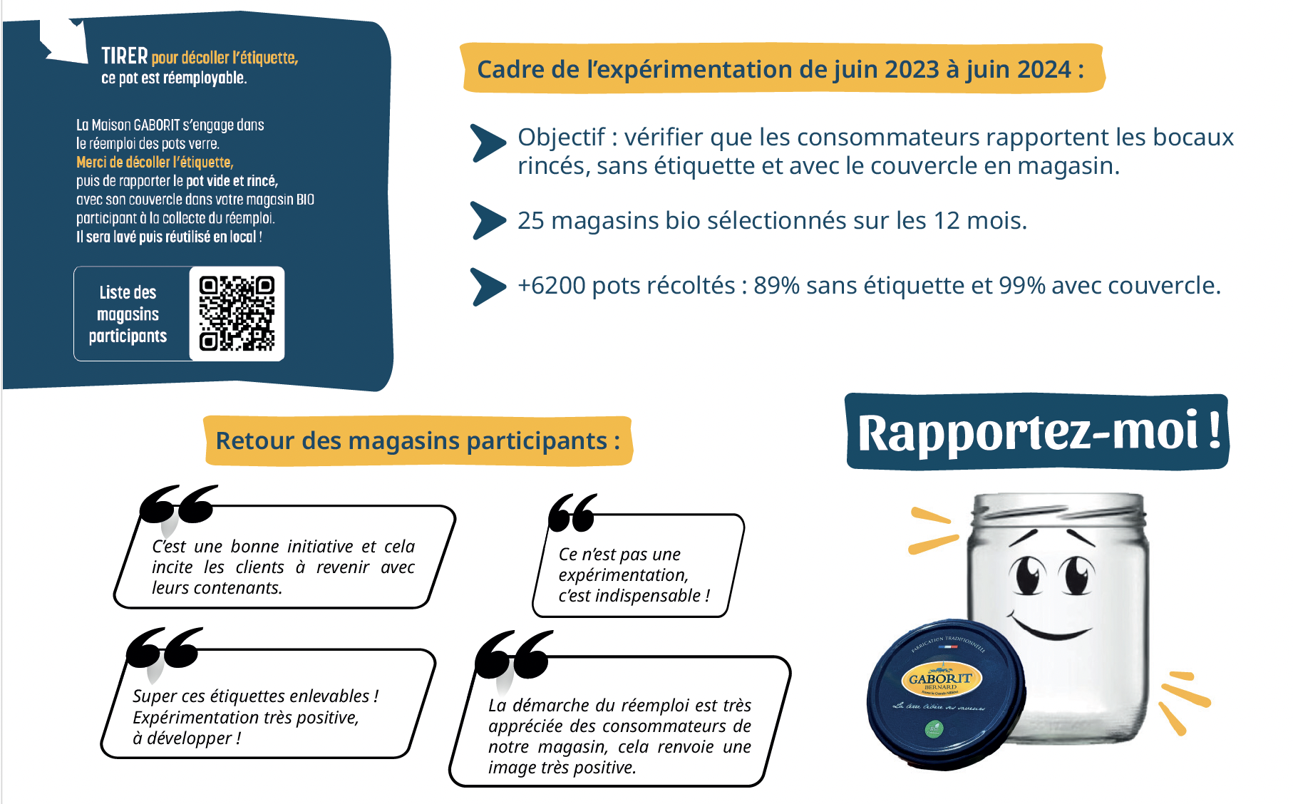 Durant un an, la Maison Gaborit a collecté plus de 5500 bocaux en verre dans les Pays de la Loire, en partenariat avec une vingtaine de magasins bio et Bout’ à Bout. En juin 2024, l’expérimentation a été validée par l’ensemble des acteurs de la boucle du réemploi (consommateurs, distributeurs, opérateur et producteur).
