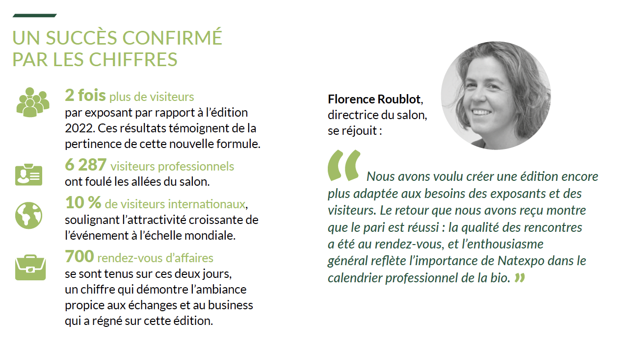 Sur le plan international, Tressbrüder, exposant allemand présent pour la première fois, a signé un contrat important durant le salon, illustrant l’attrait international de Natexpo. Tandis qu’Alexandra Guerrero, France Country Manager de Terrasana, lauréat des Trophées Natexpo affirme : " Une vraie réussite ! Ce salon 2024 a dépassé toutes nos espérances tant la qualité des échanges et la convivialité étaient au rendezvous. Vivement Natexpo 2025."