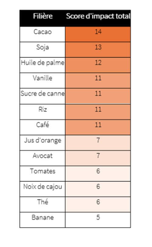 - Deux filières concentrent des impacts majeurs sur l’environnement : cacao et soja ont un impact important sur le climat, d’importants taux de déforestation et de pollution des eaux.
