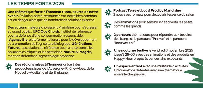 Il est nécessaire de positiver selon Ondine Prouvost, la directrice du salon. “Il faut éviter de sombrer dans la morosité ambiante. Marjolaine est et restera ce lieu d’échanges entre les consommateurs et les acteurs de la consommation éthique et responsable. 5 journées thématiques permettront un échange apaisé et positif pour continuer à changer le monde et la société à travers une infinité d’actions et de savoir-faire que Marjolaine fait découvrir au plus grand nombre.”