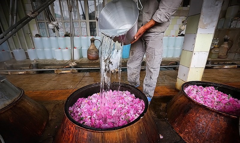 | Pour l’extraction des huiles essentielles des plantes par distillation à la vapeur en effet, les plantes ou parties de plantes sont mises dans un alambic, dans lequel de l’eau est chauffée jusqu’à l’ébullition, ce qui mène à la production de vapeur d’eau. Si les huiles essentielles sont insolubles dans l’eau (ce sont des huiles), elles sont par contre entraînées par la vapeur. Lorsque la vapeur produite traverse la couche des plantes mises dans l’alambic, elle se charge donc au passage en huiles essentielles. Au travers d’une canalisation, cette vapeur d’eau, phase gazeuse légère, s’élève puis passe dans une colonne de refroidissement ou réfrigérant. Le refroidissement est obtenu par une circulation d’eau (avec laquelle la vapeur n’est pas en contact, car elle reste dans la canalisation). | ![]() Préparation d’eau de rose à Qamsar en Iran (Photo Wikimedia Commons Mohammed Akhlaghi, Tasnim News Agency). |