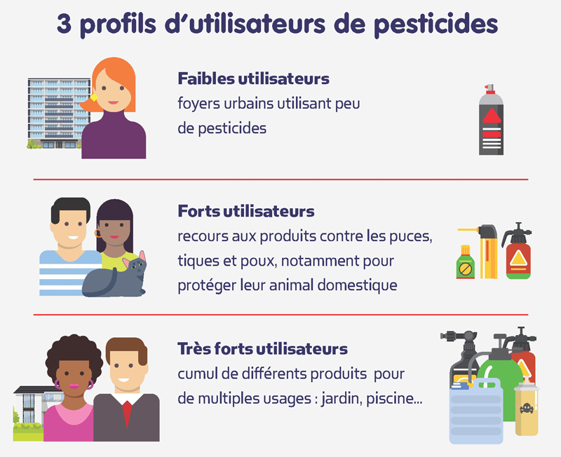 - Les très forts utilisateurs de pesticides, qui ont plusieurs usages de différents types de produits, dans leur jardin, maison, piscine, et pour se protéger eux-mêmes des insectes.