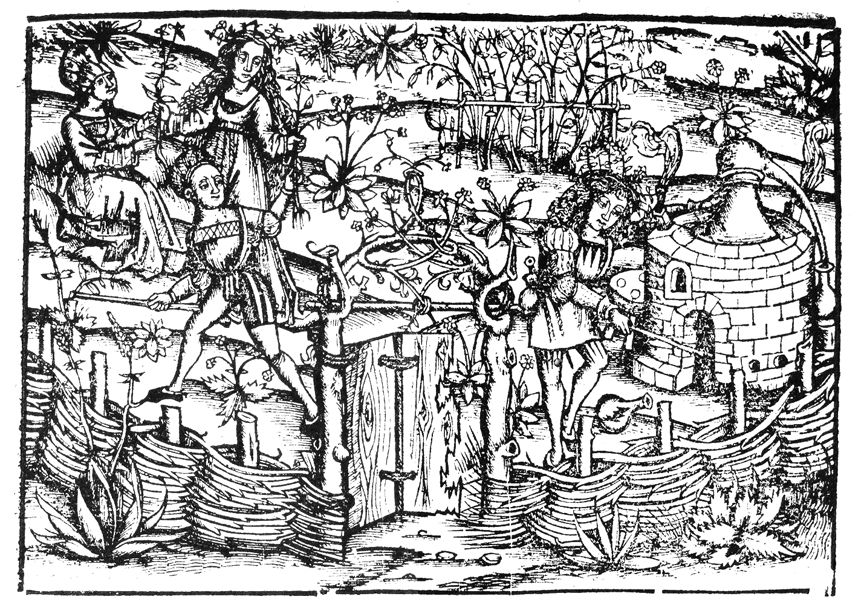 Frontispice de « Das Distilierbuch » (« Le Livre de la Distillation ») de Hieronymus Brunschwig, édité en 1521 à Strasbourg : récolte des plantes médicinales dans un jardin de plantes et distillation (image Wikimedia Commons).