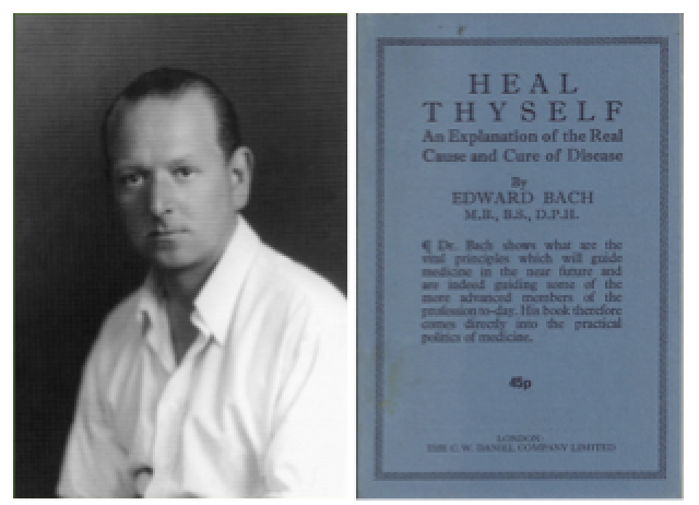 Edward Bach (à g. image Internet, DR) et la couverture de la 1re édition de son livre en 1931 (coll. privée).
