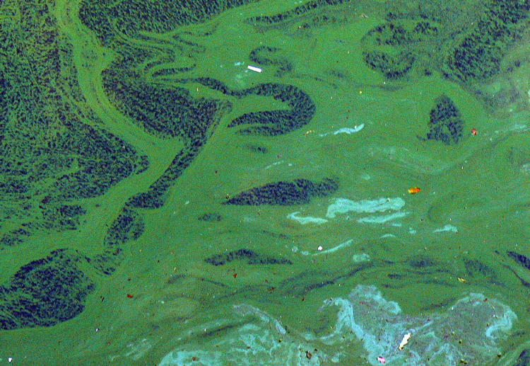 Efflorescence d’algues bleues à la surface d’un cours d’eau stagnant. La couleur bleue correspond a priori à des zones d'accumulation de pigments bleus libérés par des algues mortes (photo Lamiot, Wikimedia Commons).