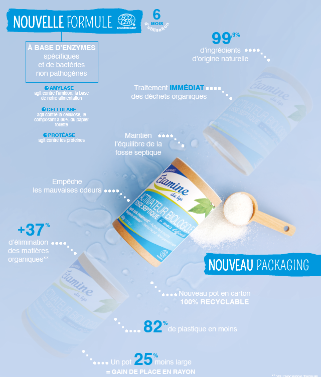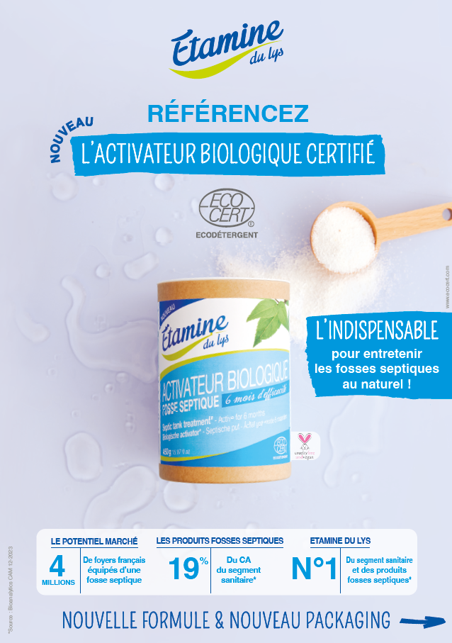 L'activateur biologique Etamine du lys est conçu pour l'entretien des fosses septiques, bacs à graisse et puisards, tout en respectant l'environnement. Certifié ECODÉTERGENT par ECOCERT, il est composé à 99,9% d'ingrédients naturels et offre une efficacité de six mois. Il réduit les vidanges, traite rapidement les déchets organiques, diminue les boues et prévient l'engorgement. Son emballage écoresponsable contient 81,9% en moins de plastique et est 100% recyclable.